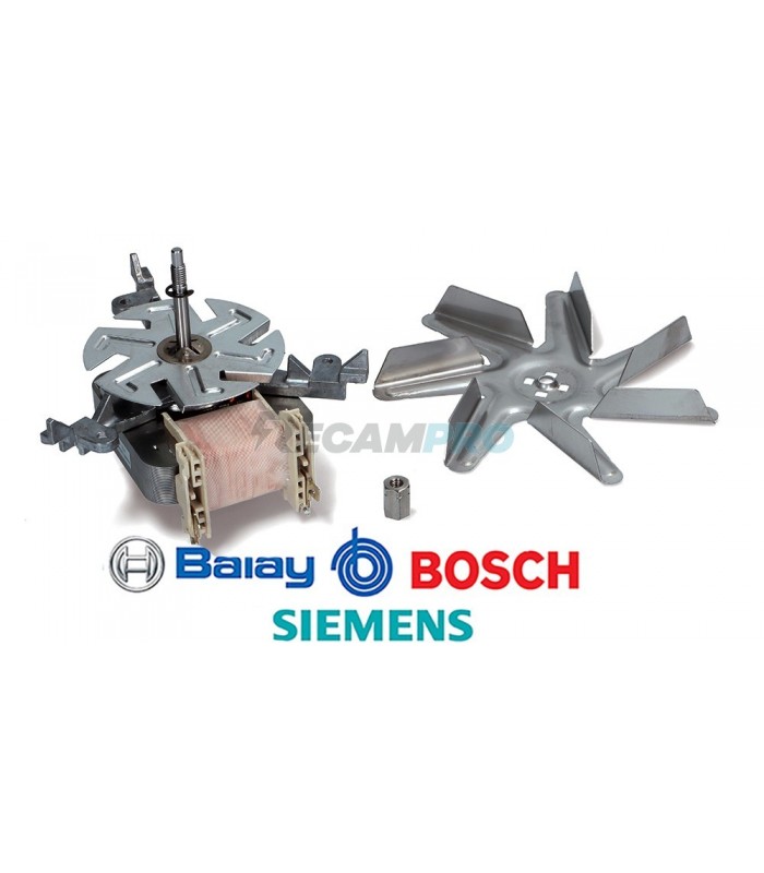 MOTOR VENTILADOR COMPLETO SUSTITUTO PARA HORNO BALAY, BOSCH, SIEMENS. 220/240 V, 50/60 Hz, 30 W, 1700-2000 rpm. Ventilador: Ø150 mm. Eje: 45 mm/18 mm.